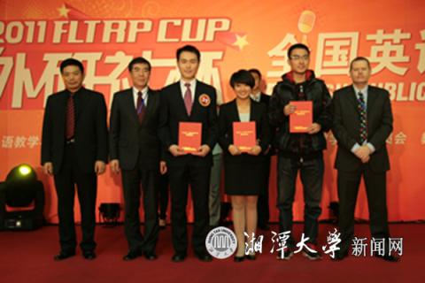 1292011“外研社杯”全國英語演講大賽決賽在北京外研社國際會議中心圓滿落下帷幕。經過54輪多種形式的賽制和極富挑戰的賽題的考驗和激烈角逐,我校法學院王宇石同學榮獲湖南省唯一的特等獎,并將于明年8月赴韓國首爾參加為期一周的亞洲辯論營。指導教師組為楊華、蔣瑤、林莉、李麗華、畢懿晴、彭薇、冷琳。