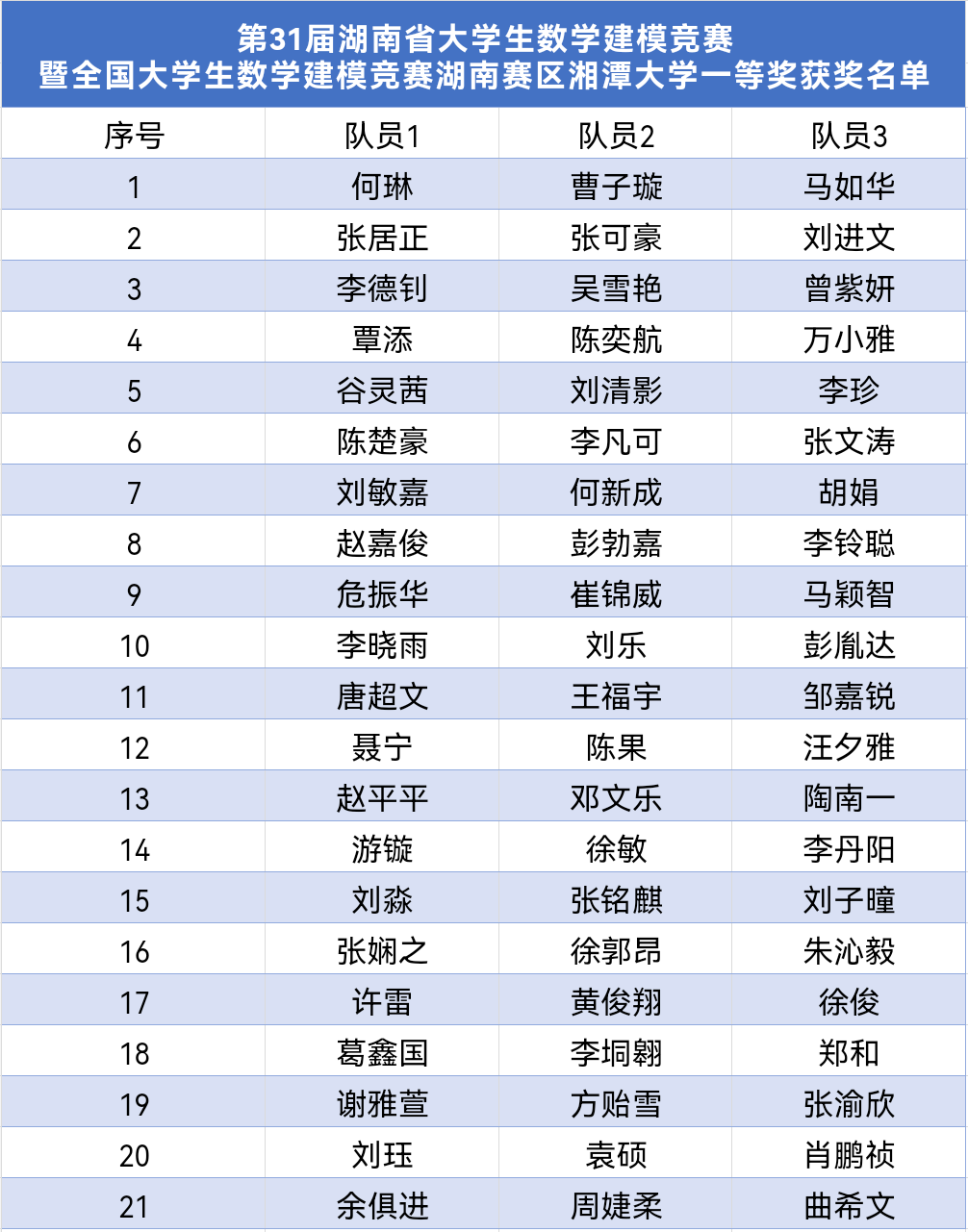 近日,2024年第31屆湖南省大學(xué)生數(shù)學(xué)建模競(jìng)賽暨全國(guó)大學(xué)生數(shù)學(xué)建模競(jìng)賽結(jié)果揭曉,我校獲湖南賽區(qū)一等獎(jiǎng)21項(xiàng)(獲獎(jiǎng)率15.4%)、二等獎(jiǎng)23項(xiàng)、三等獎(jiǎng)23項(xiàng),一等獎(jiǎng)獲獎(jiǎng)數(shù)及獲獎(jiǎng)率在湖南賽區(qū)均排名第一。