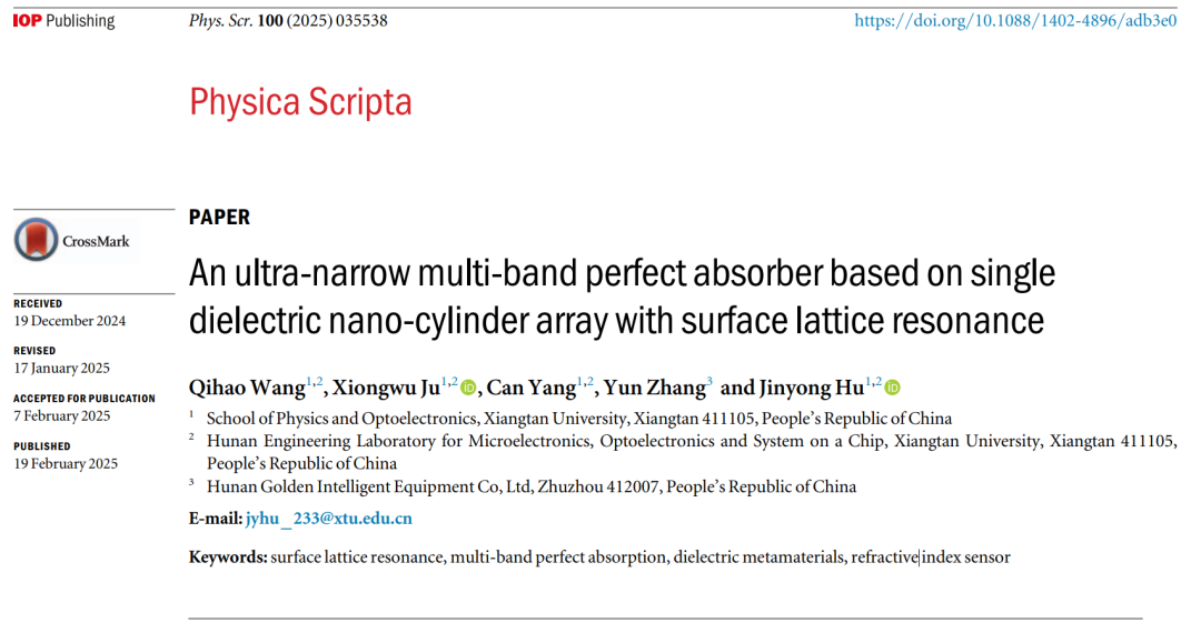 近期,物理與光電工程學(xué)院2022級(jí)微電子科學(xué)與工程專業(yè)本科生王麒浩在國際知名學(xué)術(shù)期刊上連續(xù)發(fā)表兩篇學(xué)術(shù)論文,均以第一作者身份署名。這兩篇論文分別發(fā)表在《光學(xué)通訊》(Optics Communications,JCR二區(qū))和《物理評(píng)論》(Physica Scripta,JCR二區(qū))。湘潭大學(xué)為論文第一單位,胡金勇副教授為論文通訊作者。這兩項(xiàng)創(chuàng)新性研究工作得到了國家自然科學(xué)基金、湖南省自然科學(xué)基金以及湖湘青年英才項(xiàng)目的資助。
