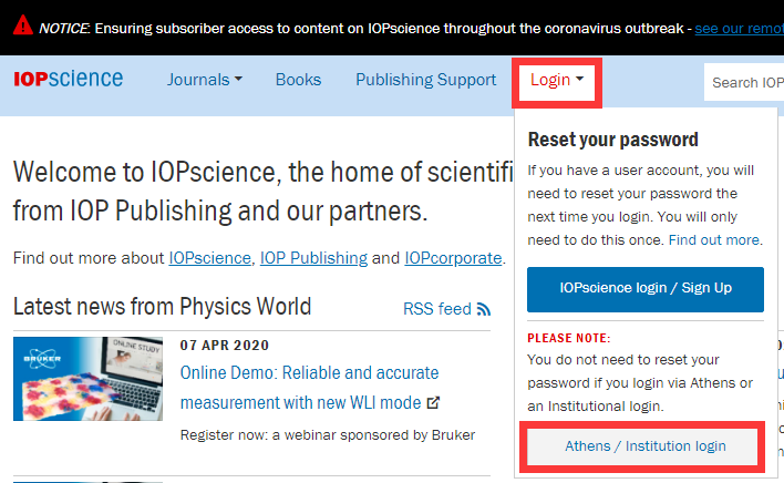 第一步,輸入https://iopscience.iop.org,或者百度搜索IOP的官網(wǎng),打開IOP平臺(tái)(注意:在校園網(wǎng)外打開)。點(diǎn)擊“Login”——“Athens/Institution login”。