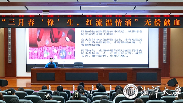 3月13日下午,我校聯合湘潭市中心血站舉辦“三月春‘鋒’生,紅流溫情涌”無償獻血宣講活動。湘潭市紅十字無償獻血志愿者服務大隊副隊長唐英姿進行生動講述,引導師生感悟生命健康的意義。
