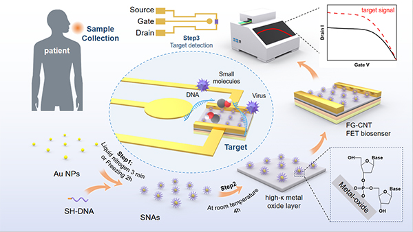 盡管FG-CNT FET生物傳感器具有巨大的潛力,但利用其進(jìn)行生物分子檢測(cè)仍存在挑戰(zhàn),即介電層上缺乏用于錨定生物探針的功能位點(diǎn)。研究團(tuán)隊(duì)提出了一種簡(jiǎn)單、溫和且通用的方法,利用DNA功能化金顆粒(球形核酸, SNAs)與晶體管柵介質(zhì)層的強(qiáng)多價(jià)相互作用和SNA本身的三維結(jié)構(gòu),實(shí)現(xiàn)在浮柵型FET傳感器上溫和、高效的探針修飾,其結(jié)合力媲美共價(jià)修飾(圖1)。同時(shí)得益于浮柵型碳納米管傳感器件的高效響應(yīng)機(jī)制,經(jīng)SNAs功能化的傳感器可實(shí)現(xiàn)低至阿摩爾的目標(biāo)物檢測(cè),僅需修改SNAs上的DNA序列,即可實(shí)現(xiàn)對(duì)不同類型標(biāo)志物的精準(zhǔn)檢測(cè)。