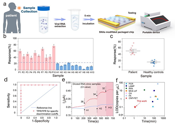 圖2. SNA修飾傳感器件對(duì)臨床樣本中未擴(kuò)增的腸道病毒71型實(shí)現(xiàn)高靈敏檢測(cè)。